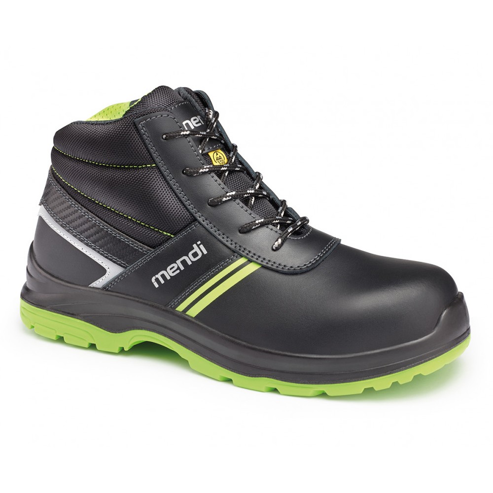 Bota piel negra hidrofugada, Incorpora puntera de fibra de vidrio y plantilla anti perforación textil. Suela de PU2D bicolor que facilita la visibilidad, zona de puntera y talón reforzada con grips antideslizantes y amplios canales de evacuación.