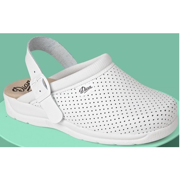 Zueco con correa abatible de sujeción en el talón, fabricado en microfibra técnica perforada con acolchado D’COVER OEKOTEX ® en el empeine para evitar rozaduras, Suela antibacteriana de poliuretano en forma de cuña, antideslizante de doble densidad, bicomponente de poliuretano y TPU combinados para aumentar el coeficiente de eficacia antideslizante del zueco.
